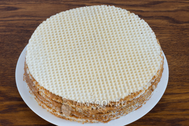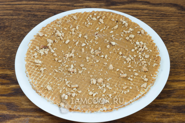 На плоскую тарелку - немного крема, чтобы коржи не «ездили». Положите первый вафельный корж, равномерным слоем нанесите 2-2,5 ст.л. крема (очень удобно пользоваться для разравнивания силиконовой лопаткой). Выложите второй корж, также нанесите крем и посыпьте толченым арахисом.
