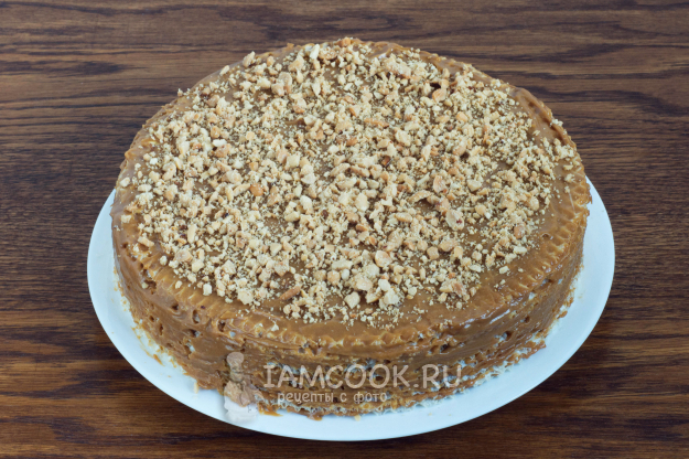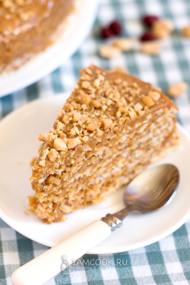Прослаивайте коржи кремом, посыпая каждый второй корж измельченным арахисом. Верхний корж не смазывайте кремом. Положите на него плоскую тарелку и небольшой груз. На час-два поставьте тортик в холодильник.