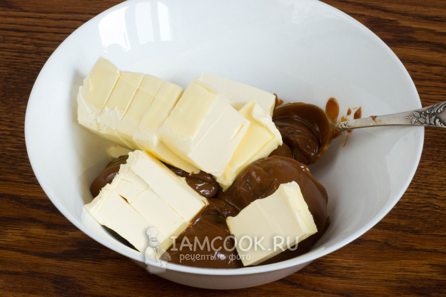 Вареное сгущенное молоко переложите в большую миску, добавьте размягченное сливочное масло.