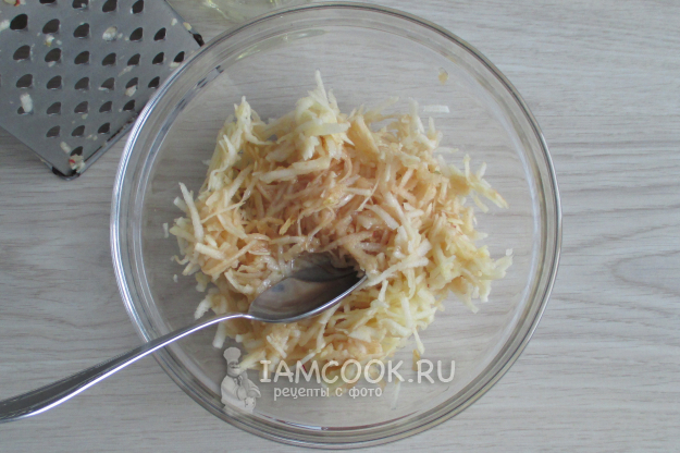 Для теста мякоть яблок (без кожуры и сердцевины) нужно натереть. Лучше - на крупной терке, чтобы меньше сока выделялось.