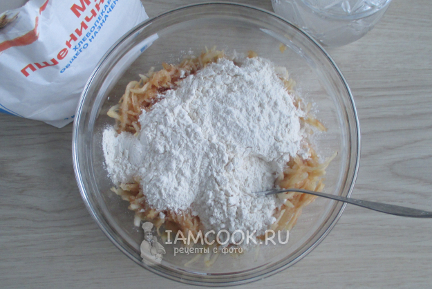 Добавьте сахар и муку, её количество может варьироваться в зависимости от сочности яблок. Перемешайте.