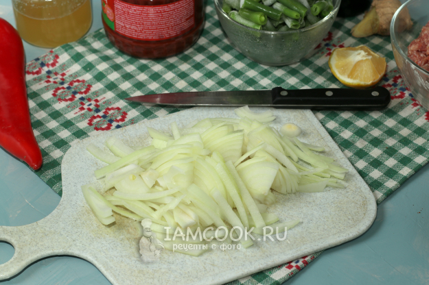 Нарезать соломкой репчатый лук.