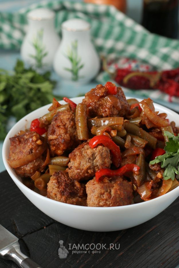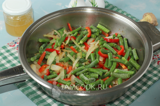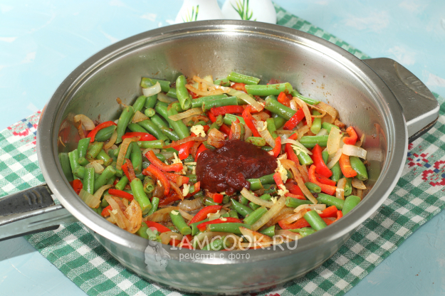 В сковороду, где готовились фрикадельки, добавить лук, обжарить его 5 минут, добавить сладкий перец и готовить ещё 2-3 минуты. Затем в сковороду добавить стручковую фасоль и готовить ещё 3 минуты. Если используете замороженную фасоль, то размораживать её не нужно.