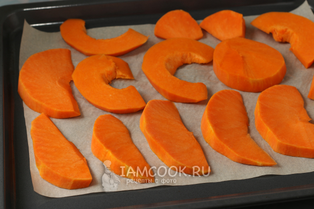 Тыкву я почистила, нарезала скибками и разложила на пергаменте. Запекала при 200 градусах около 20 минут. Время запекания может быть разным, зависит от сорта тыквы, толщины ломтиков и особенностей каждой духовки. Запекаю я всегда целым противнем, а что не используется в смузи, можно съесть просто так или приготовить что-нибудь из выпечки.