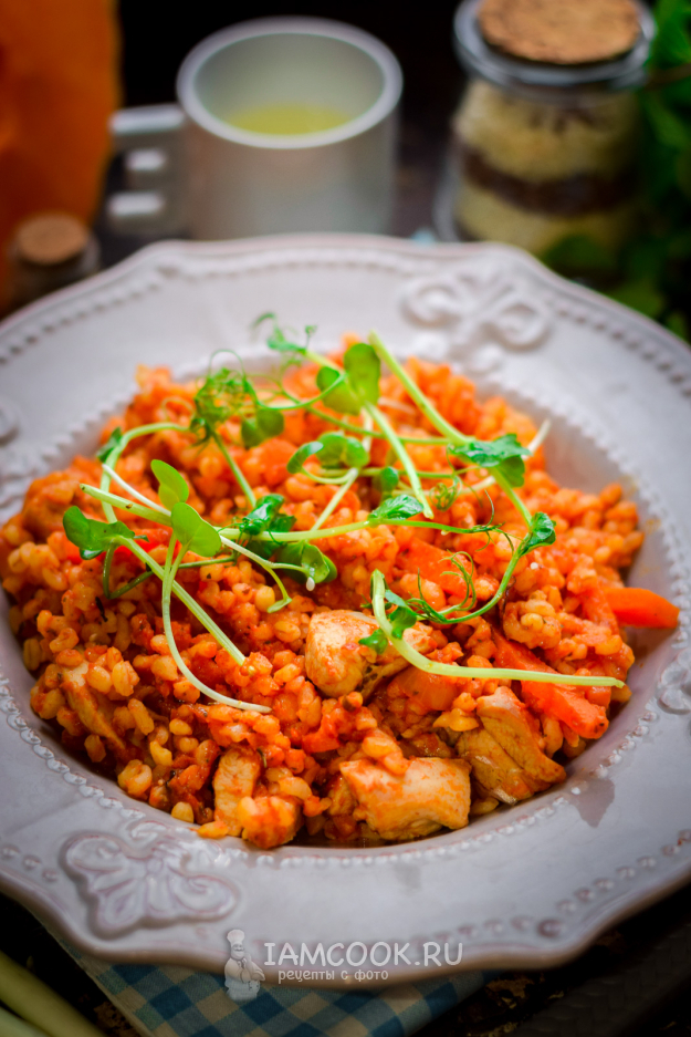 Вкусно и просто приготовить можно булгур с курицей в томатном соусе, это вариант сытного обеда для всех членов семьи. Булгур прекрасно сочетается по вкусу с овощами и курицей, по желанию мясо можно использовать любое. Томатный соус можно взять домашний, а можно использовать магазинный. Подавать к столу готовый булгур можно с разными свежими овощами или домашними соленьями. Непременно попробуйте рецепт, блюдо простое и получается довольно аппетитным.