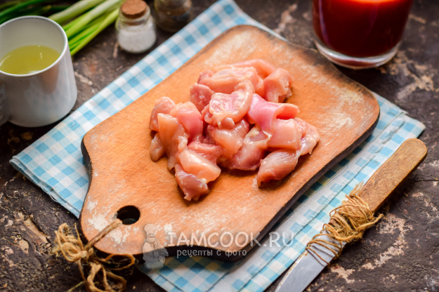 Куриные бедра нарезать небольшими по размеру кусочками.