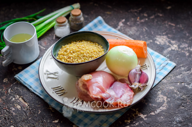 Подготовить все ингредиенты для приготовления булгура с курицей в томатном соусе. Куриные бедра использовать без кожи и костей.
