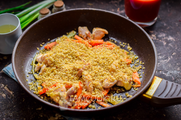 После добавить в сковороду булгур, соль и перец.