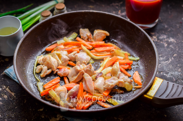 В сковороде прогреть растительное масло, выложить овощи и курицу, жарить 3-4 минуты.