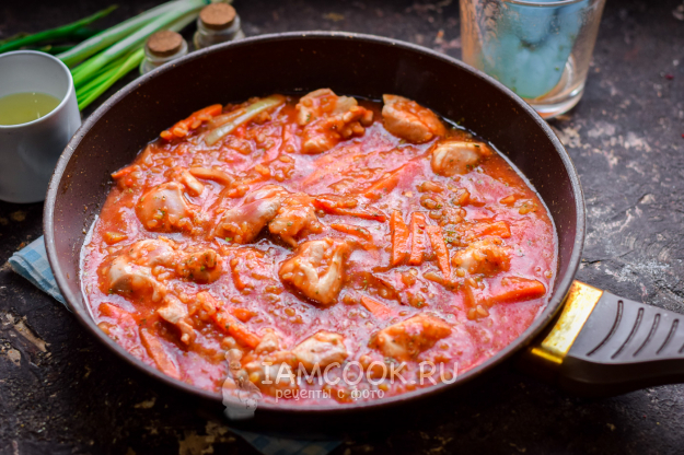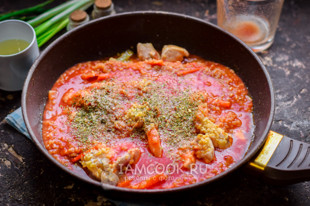 Следом добавить в сковороду томатный соус и воду, всыпать специи.