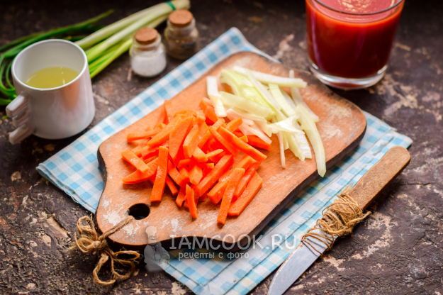 Очистить морковь и лук, овощи сполоснуть и просушить. Нарезать морковь полосками, лук нарезать полукольцами.