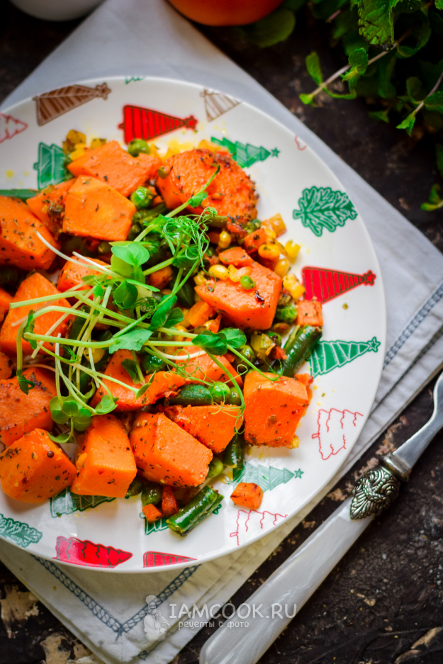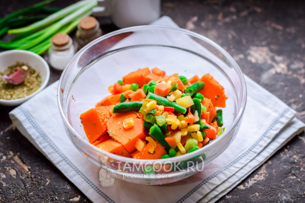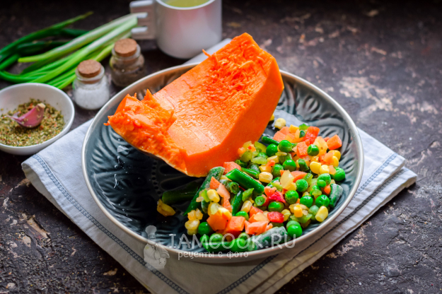 Добавить к тыкве овощи. В нашем варианте использовались замороженные овощи, вы можете взять любые.