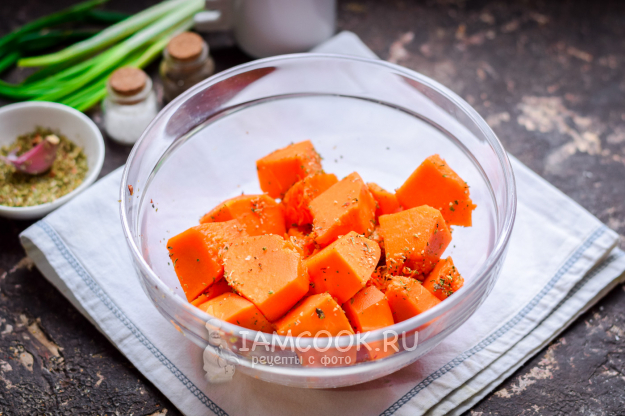 Аккуратно почистить тыкву от жесткой кожуры, после необходимо тыкву нарезать небольшими кубиками, сразу можно добавить в тыкву все специи и травы, которые вы любите.