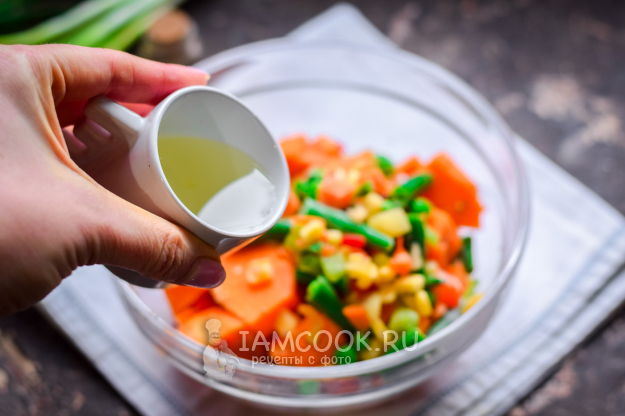 Влить в миску масло и перемешать все руками. По желанию можно добавить немного соевого соуса.