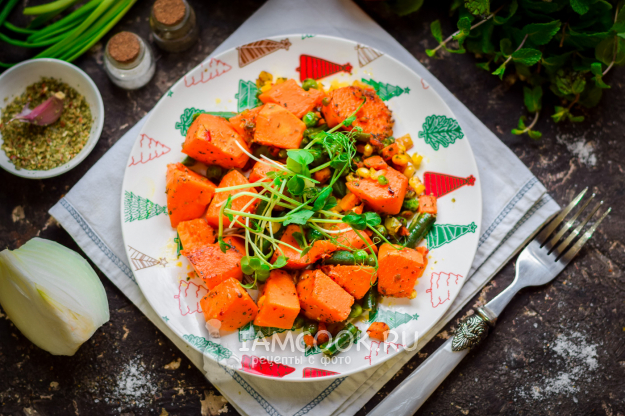 Когда нет времени на длительное стояние у плиты, и когда вот вовсе не хочется заморачиваться с приготовлением гарнира, поступаем просто и быстро – берем тыкву, любые овощи, которые есть в холодильнике или морозильной камере, все кладем в фольгу, добавим специи и травы, запечем и можно подавать к столу – вкусно и аппетитно. Подавать тыкву с овощами можно самостоятельно, можно добавить разные виды овощей или солений, можно добавить рис или запеченный картофель.