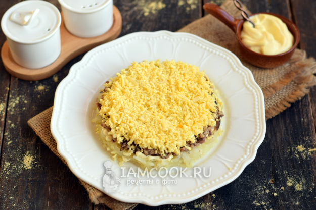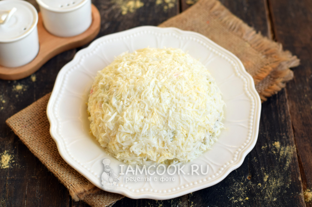Яичные белки измельчите, покройте ими весь салат, сформировав полусферу.