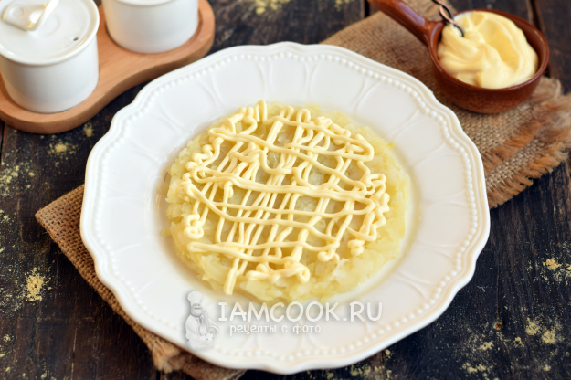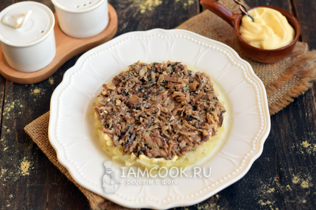 Картофель отварите в кожуре до готовности, полностью остудите, очистите, натрите на крупной терке. Выложите картофель первым слоем на плоском блюде, сформировав круг самостоятельно, или используя формовочное кольцо. Картофель смажьте майонезом.