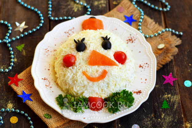 Слоеный салат «Снеговик» со шпротами готов. Подайте его на стол.