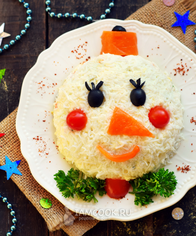 Для встречи Нового года каждая хозяюшка пытается украсить свой стол вкусными и красивыми блюдами, которые будут соответствовать новогодней тематике. Предлагаем приготовить вкусный слоеный салат на основе консервированных шпрот, при этом сформировать его в виде головы снеговика. Такая идея понравится не только детям, но и взрослым, удивит и вызовет восторг.