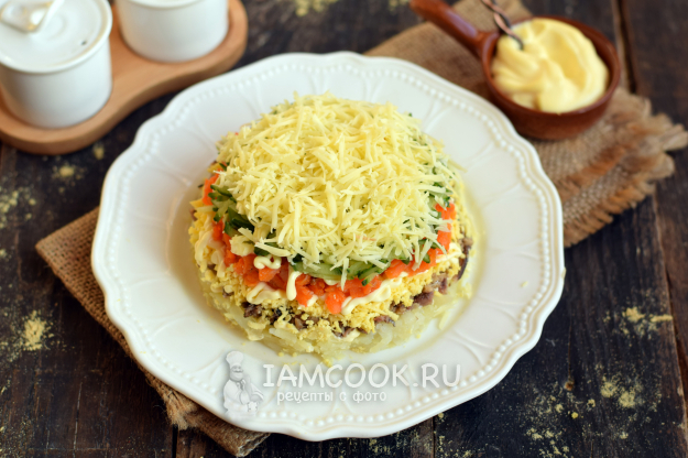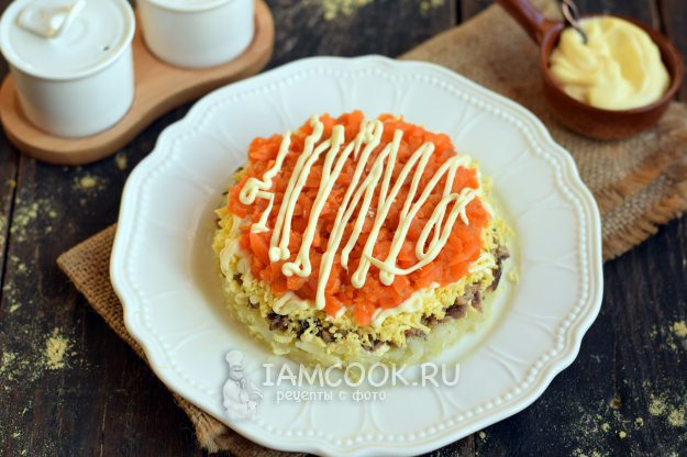 Морковь сварите в кожуре до мягкого состояния, остудите, натрите на терке, выложите следующим слоем, смажьте майонезом.