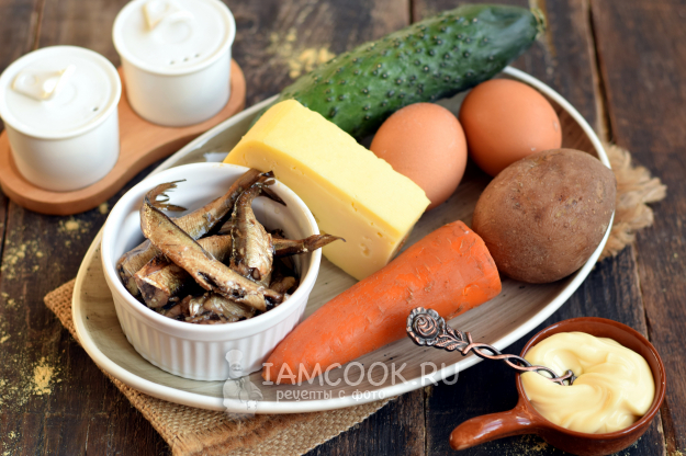 Продукты для салата «Снеговик» со шпротами подготовим по списку ингредиентов.