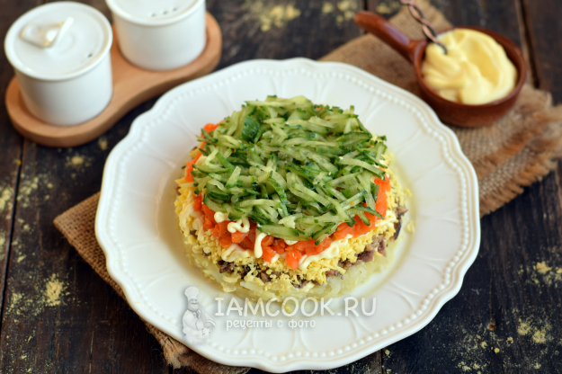 Огурцы нарежьте полосками, уложите сверху моркови, майонезом смазывать их не нужно.