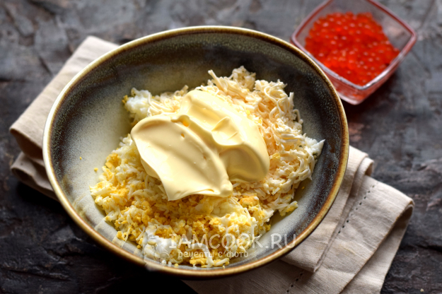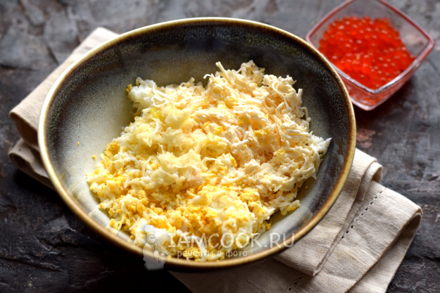 Яйца отварите «вкрутую», охладите в воде, счистите скорлупу, натрите на мелкой терке. Мягкий плавленый сырок также измельчите с помощью терки. Компоненты соедините в одной емкости.