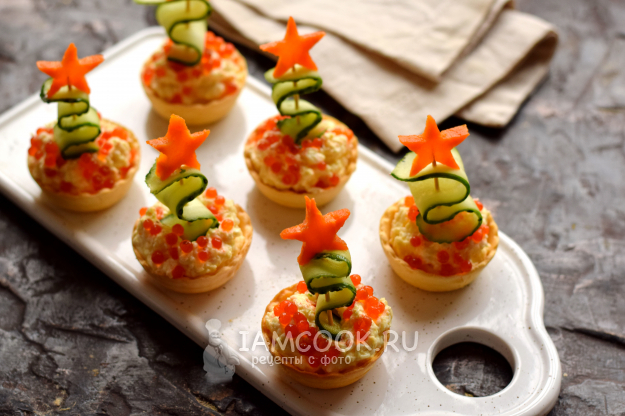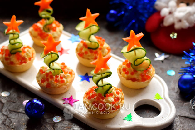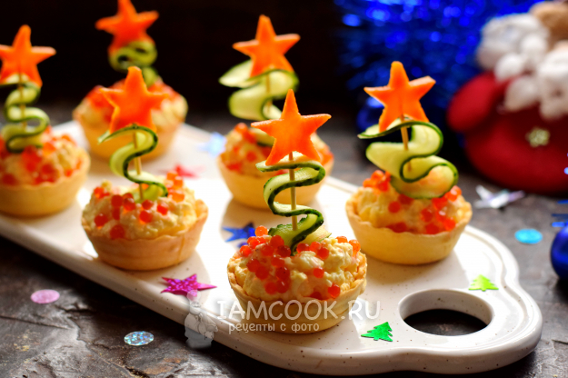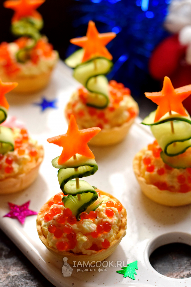 Готовим закуску из тарталеток в виде небольших елочек. В качестве начинки используем яично-сырную смесь с тонкими нотками чеснока. Елочки формируем из свежего огурца, звезды — из моркови. В результате получаются оригинальные миниатюрные елочки, которые украсят новогодний стол. Проявив немного фантазии, всегда можно создать кулинарный шедевр, который раскроет ваши таланты.