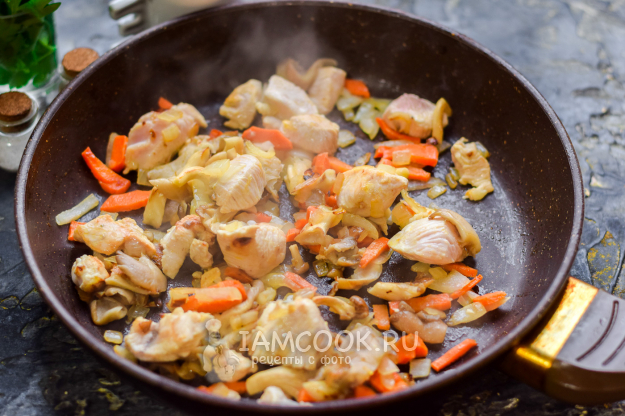 В сковороде прогреть масло и выложить курицу, грибы, морковь и лук. Жарить 10-12 минут, периодически помешивая.