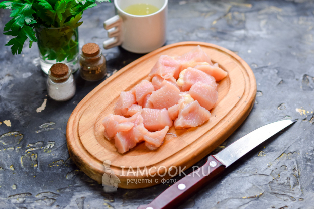 Куриное филе также сполоснуть и просушить, нарезать небольшими кусочками.
