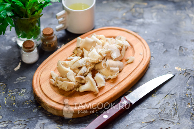Вешенки сполоснуть и просушить, нарезать произвольно.
