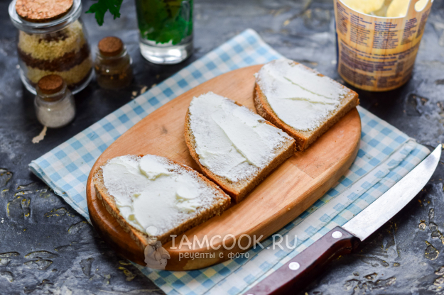 Ломтики хлеба смазать любимым сливочным сыром, по желанию добавить специи.