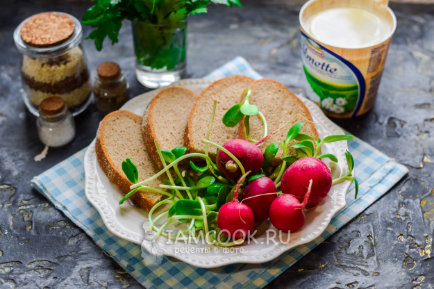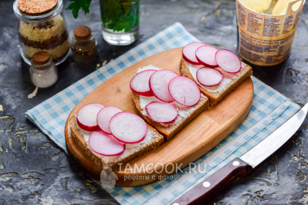 Редис сполоснуть и просушить, нарезать пластинами и переложить редис на ломтики хлеба.