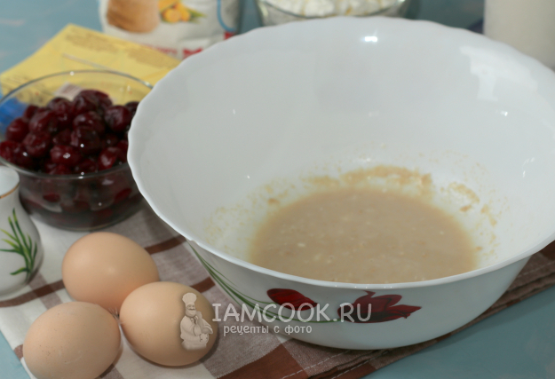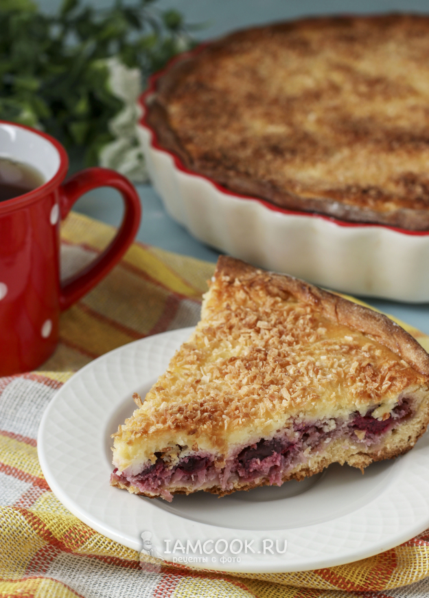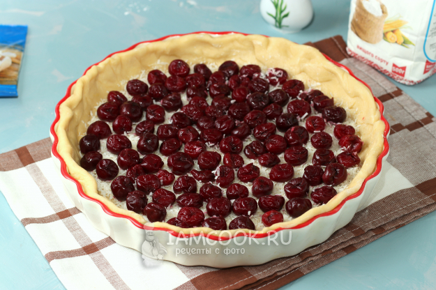 Вишню посыпать крахмалом и выложить сверху творожную начинку. Сверху посыпать оставшейся кокосовой стружкой.