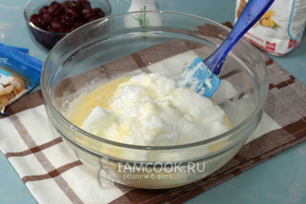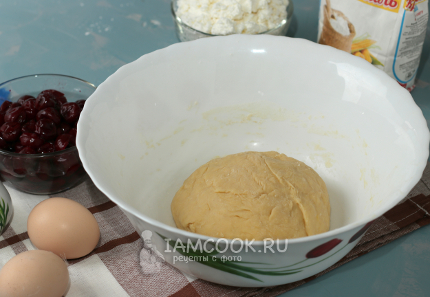 Минут за 10 до того, как тесто уже будет готово к работе, приготовить начинку. Смешать в миске творог с мягким сливочным маслом, сахаром и мукой. Яйца разделить на желтки и белки. Желтки вмешать в творожную массу. Белки взбить до пиков со щепоткой соли, затем аккуратно смешать с творожной начинкой.