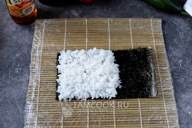 Каждый лист нори разрежьте на две одинаковые полоски. Выложите пару ложек риса, чуть меньше половины водорослей оставьте свободными.