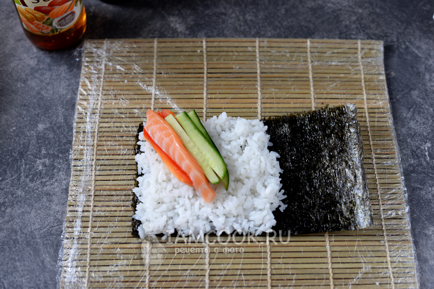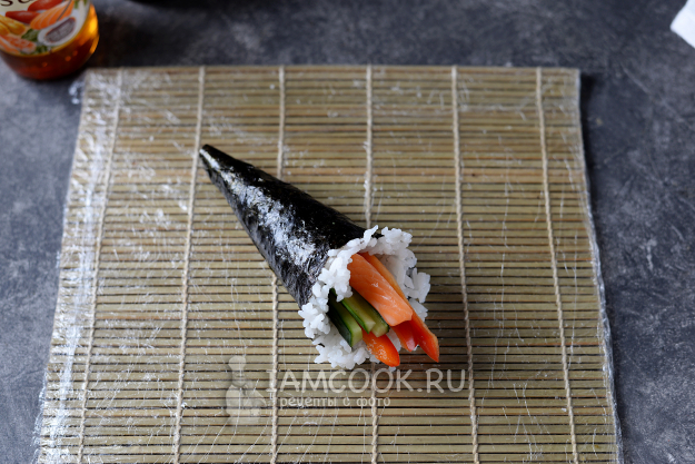 Нарежьте огурец, перец и семгу ломтиками, выложите на рис, скрутите кулечком, свободную от риса полоску нори чуть смажьте водой, чтобы легче склеилось.
