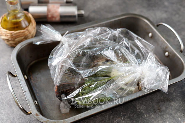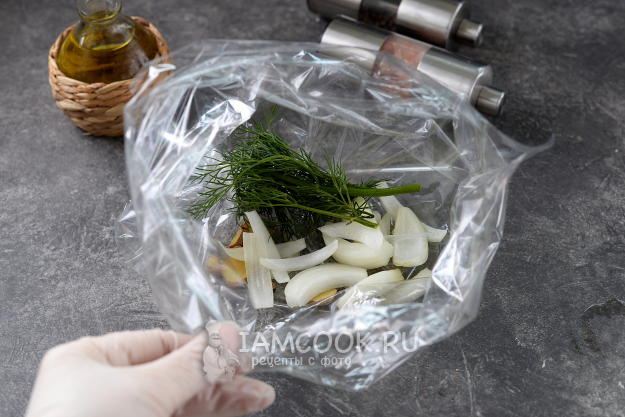 Рукав для запекания завяжите с одной стороны плотно нитью, внутрь положите оставшийся укроп, нарезанный тонкими ломтиками репчатый лук и имбирь.