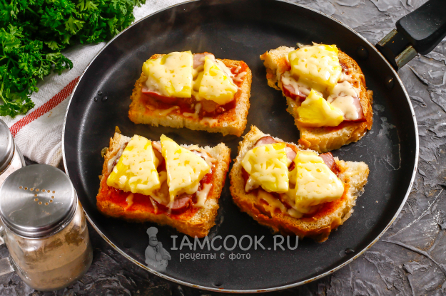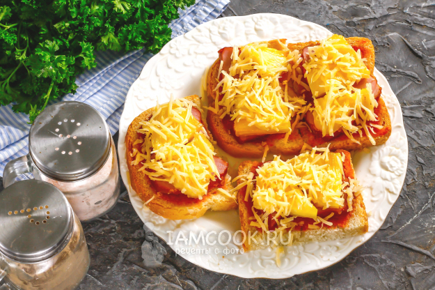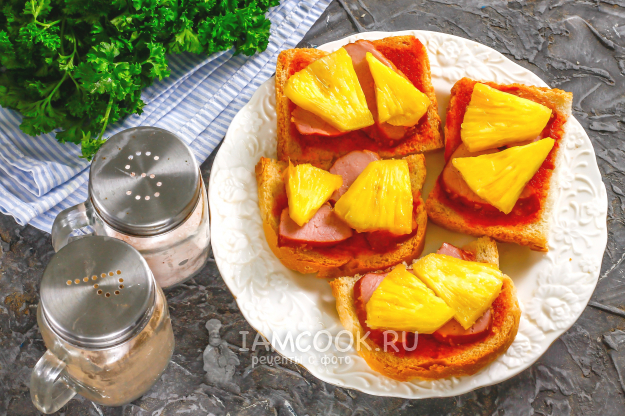 Ананас допустимо использовать как свежий (нарезанный, как у меня), так и консервированный. В любом случае бутерброды получатся очень вкусными. Одно «но» - если вы не любите вкусовых сочетаний мясных изделий с фруктами, то рецепт не для вас!