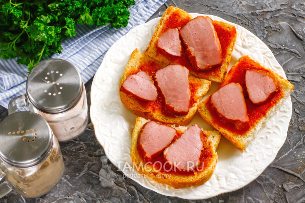Хлебные ломтики разрежьте пополам, обмажьте выбранным вами соусом. У меня это не горький кетчуп.