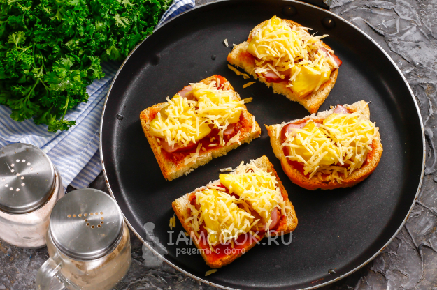 Затем влейте 3 ст.л. воды, нагрев уменьшите до минимального и накройте емкость крышкой. Пропарьте бутерброды до тех пор, пока сыр не расплавится. Потребуется еще воды - долейте.