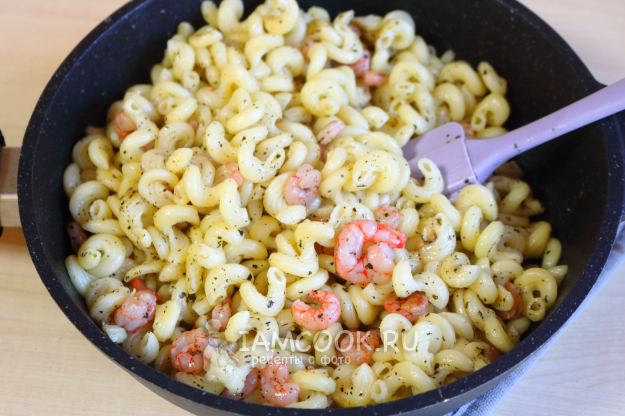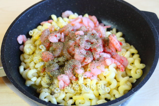 Пока варятся макароны, разогреваем сковороду. И открываем уже размороженных креветок, сливаем лишнюю жидкость. Выкладываем на сковороду сливочное масло, отварную пасту, креветок, а также специи по вкусу. Я кладу лишь базилик, а соль и перец использую для подачи.