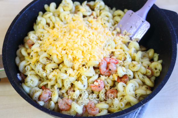 Тем временем быстро сервируем стол. Раскладываем пасту с креветками и сыром по тарелкам, сверху посыпаем ещё сыром и сразу, не медля, подаём к столу и наслаждаемся. Приятного аппетита!