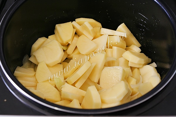 Когда лук будет обжарен, измените программу на «Тушение» или «Овощи» (температура 105°С) и выставьте время 75 минут. Сверху лука положите картофель. Залейте картофель водой так, чтобы вода его практически полностью покрывала.