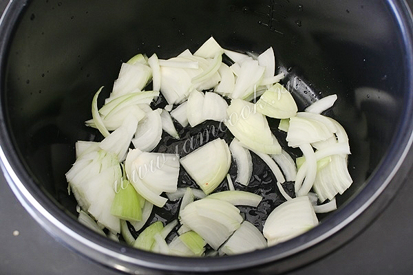 В чашу мультиварки налейте немного растительного масла и включите программу «Жарка» или программу «Выпечка». Положите в чашу лук и обжарьте его с открытой крышкой в течение 5-7 минут периодически переворачивая.