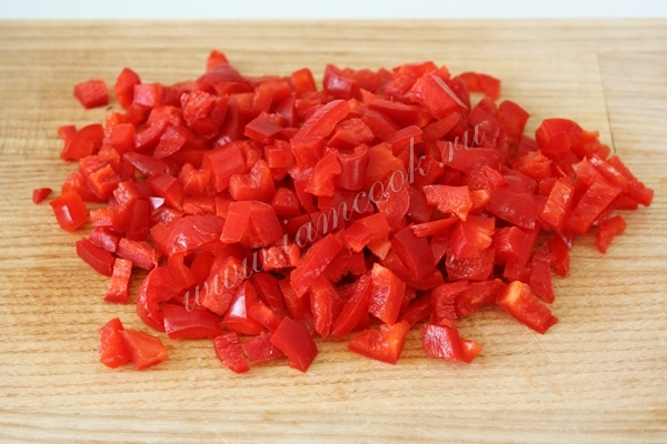 Болгарский перец очистите и нарежьте соломкой или небольшими кусочками.