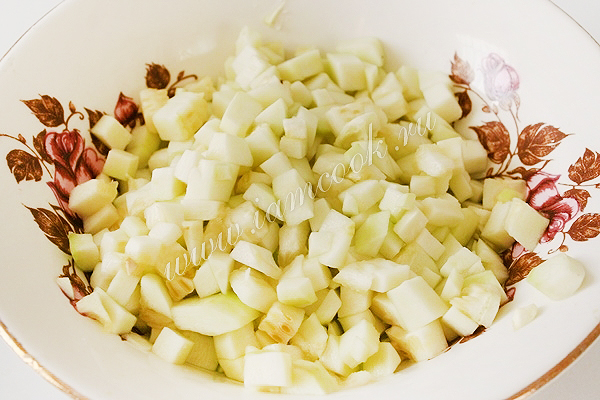 Кабачки очистите и также нарежьте небольшими кубиками.