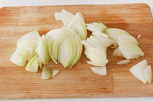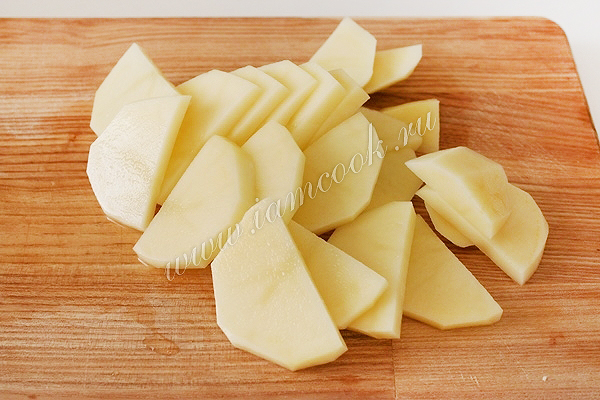Пока жариться лук начистите картофель. Порежьте его небольшими кусочками.