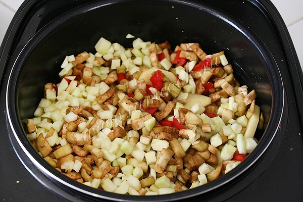 Сверху выложите болгарский перец, баклажаны и кабачки. Закройте крышку мультиварки и не открывайте 1 час.