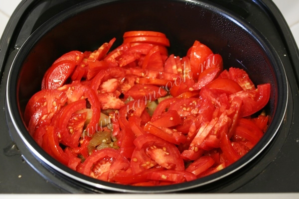 Нарежьте помидоры. Если используете помидоры с жесткой шкуркой, то желательно её сначала снять, а затем нарезать помидоры. Сделать это просто, если свежие помидоры ошпарить кипятком или положить помидоры в кастрюлю с кипящей водой на 30 секунд, а затем достать шумовкой. За 15 минут до окончания программы «Тушение» откройте крышку мультиварки и добавьте нарезанные помидоры.